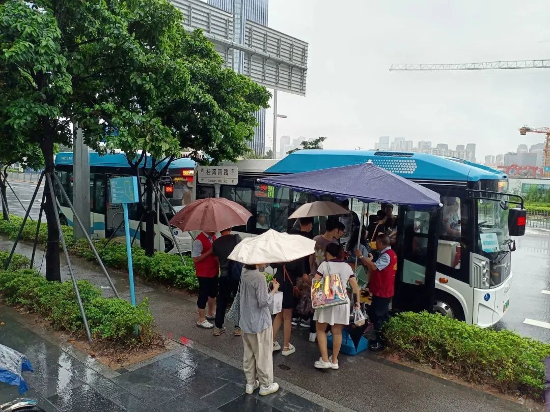 早上8:00,在位于福田的华强北公交站,记者看到坐车上班的市民不少,都正在排队有序等车上车。在位于罗湖清水河的泥岗村牌坊站,记者看到,雨虽大,但这里的公交仍在正常运营,市民交通出行并没有受到太大影响。