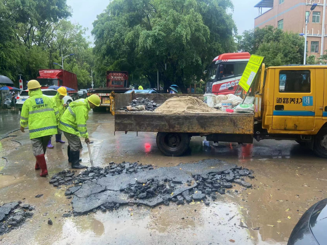 ▲市交通运输局福田管理局工作人员抢修道路坑洞。