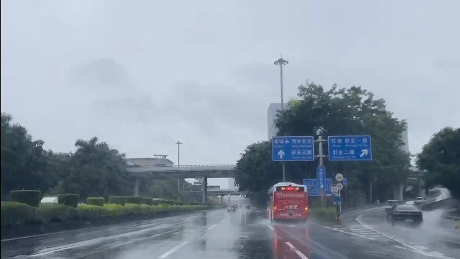 ▲雨势渐小,107国道(宝安段)上车流较往日减少。(图源:深圳新闻网)