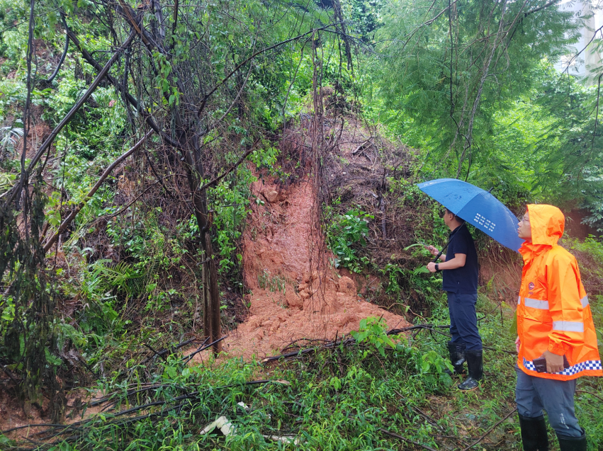 ▲市交通运输局宝安管理局工作人员到西宝线南侧004号边坡检查边坡侧面坡体局部土体滑塌情况。