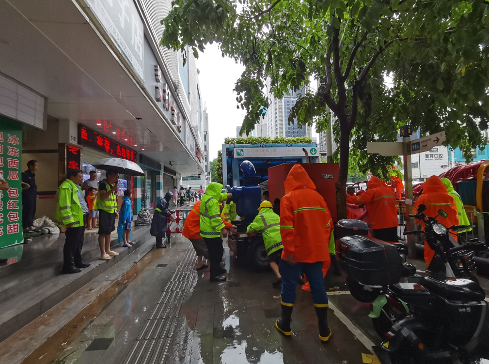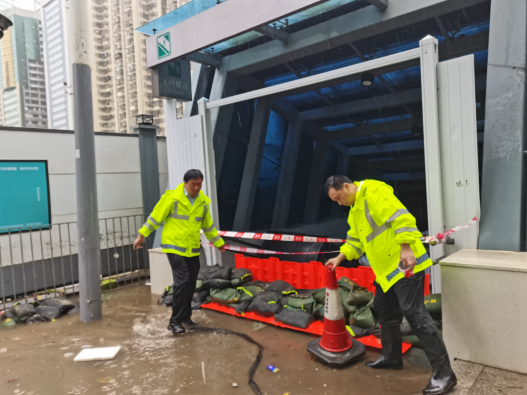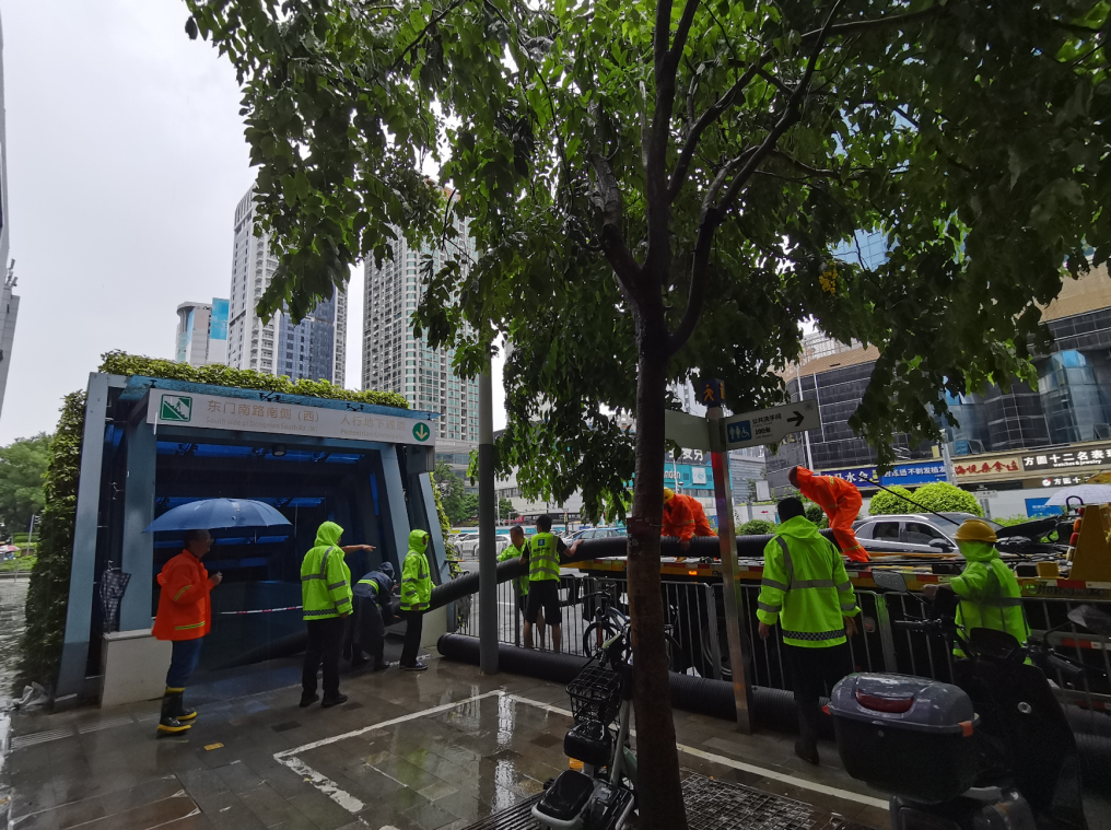 ▲市交通运输局福田管理局工作人员汛期应急抢险,第一时间前往深南红岭地下通道持续抽水,将强降雨可能造成的影响降至最低。