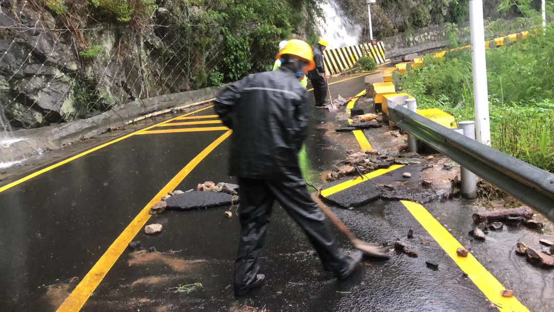 ▲市交通运输局盐田管理局工作人员在恩上公路清理落石。
