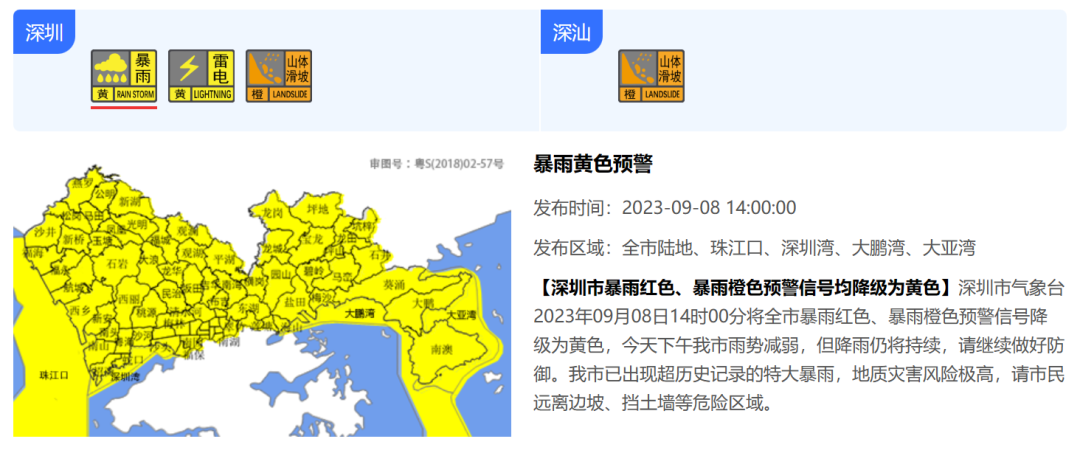 路面交通 :全市除罗湖区、盐田区、宝安区、龙华区 共有7处因严重积水、小面积滑坡实施交通封闭外,均已恢复交通。