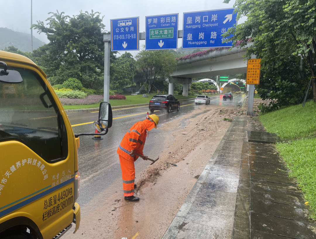 ▲市交通运输局盐田管理局工作人员清理惠深沿海高速莲塘至盐田段路面泥沙、树枝落叶等障碍物,恢复路面干净。