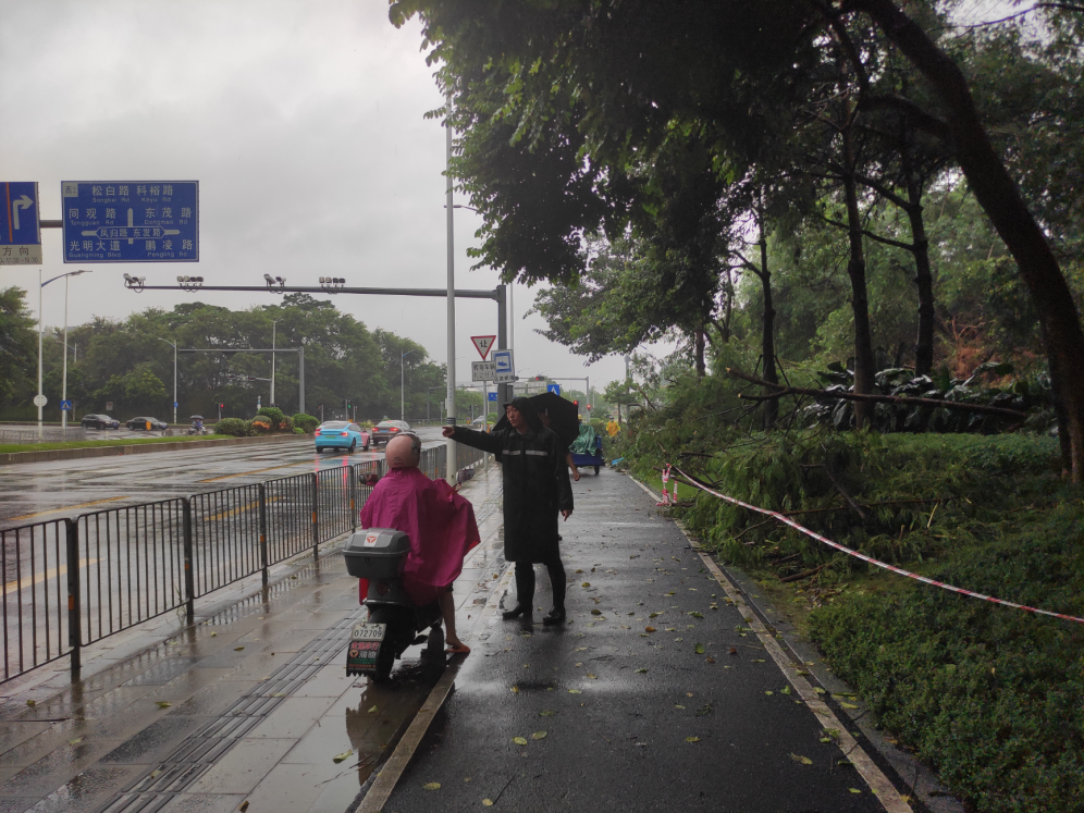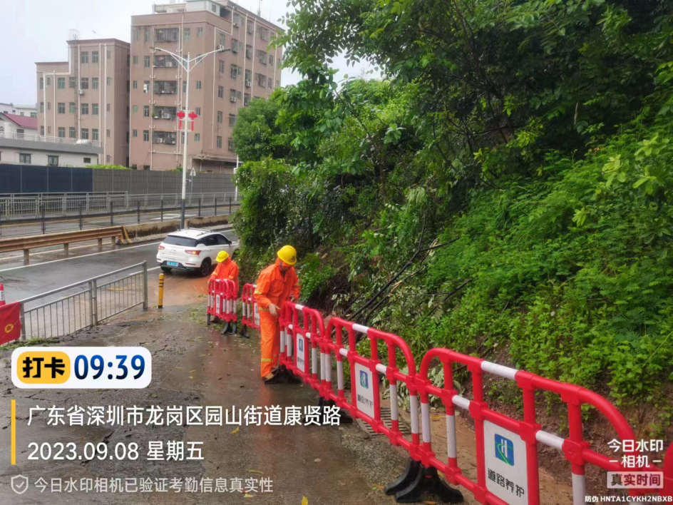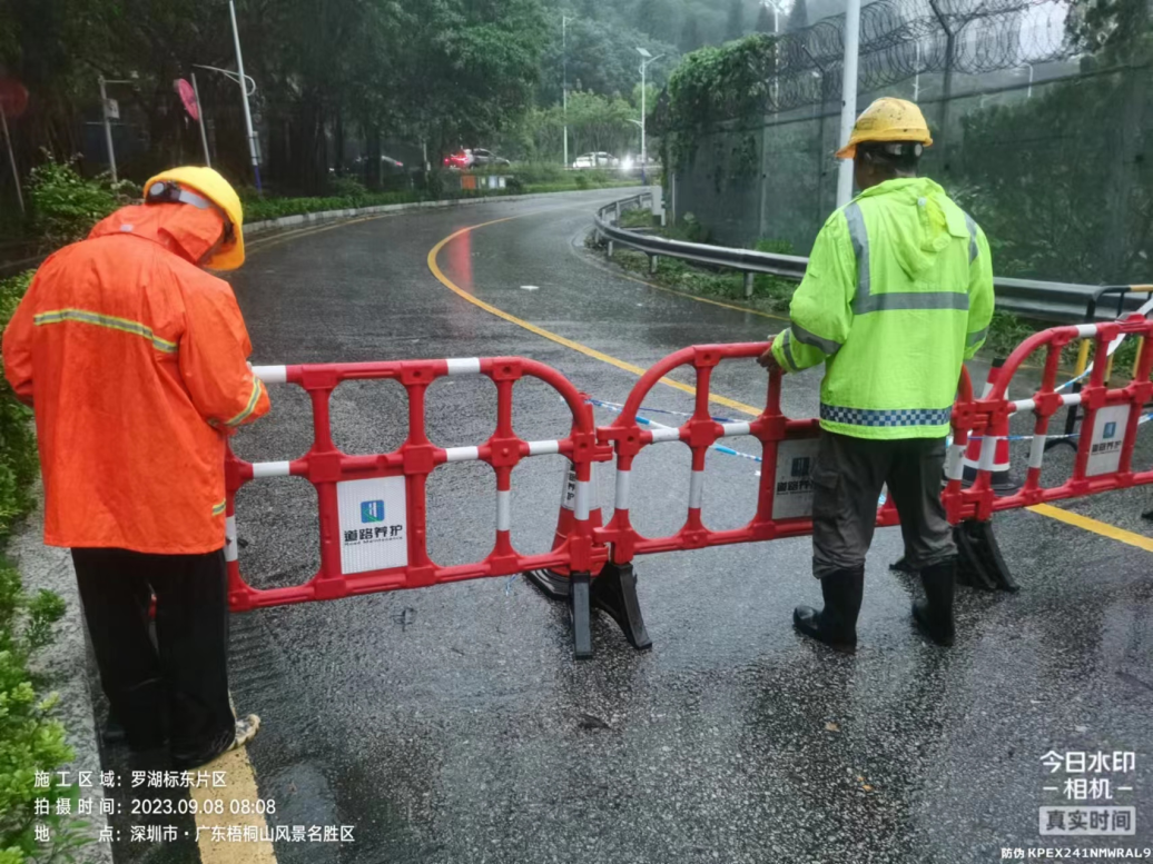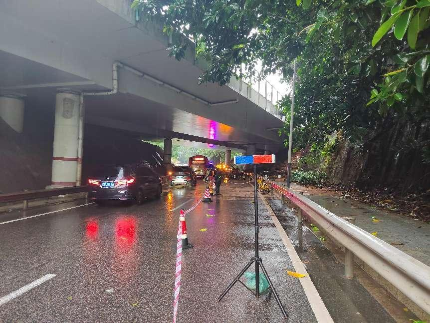 ▲市交通运输局龙华管理局工作人员协助交警、街道对大浪街道石观路挡墙滑坡进行安全围挡及交通指挥。
