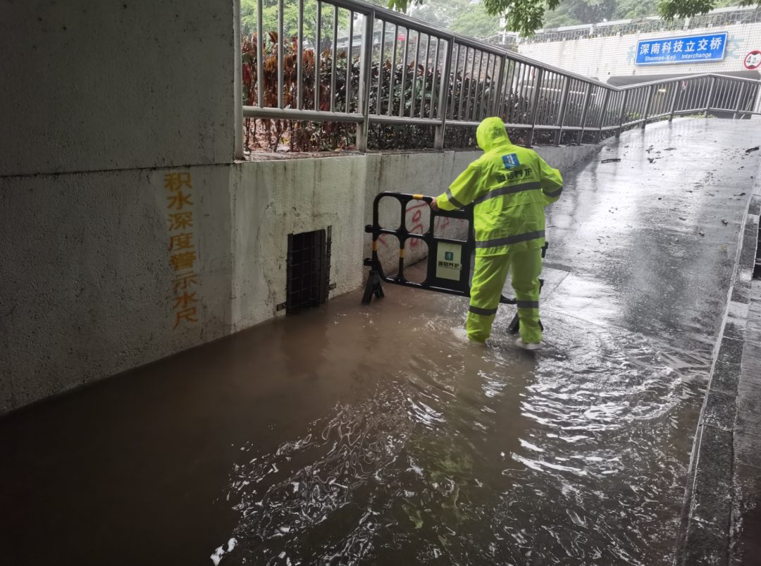 ▲市交通运输局南山管理局工作人员巡查发现深南科技立交地下通道积水,已做好警示。