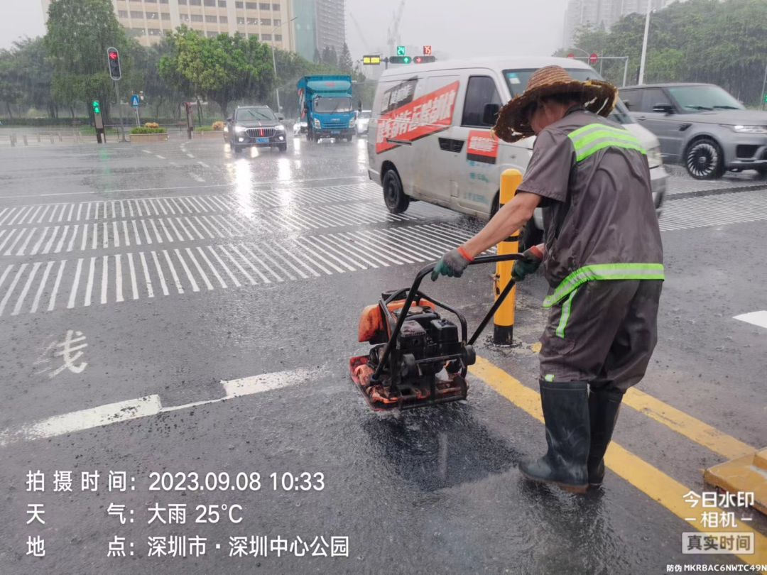 ▲市交通运输局坪山管理局工作人员清理维护同富裕路积水破损路段。