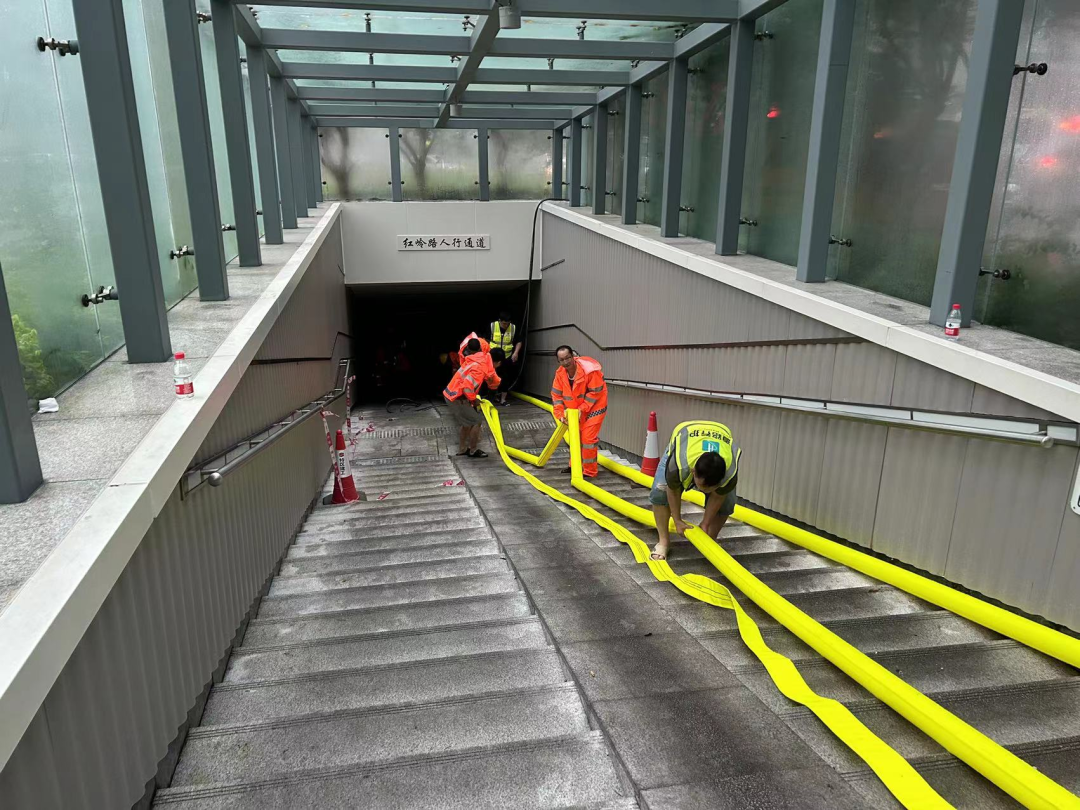 ▲东门南路地下通道,人行通道严重积水淹没通道,市交通运输局罗湖管理局工作人员用抽水泵大排水管道抽水,通道水位已降低。