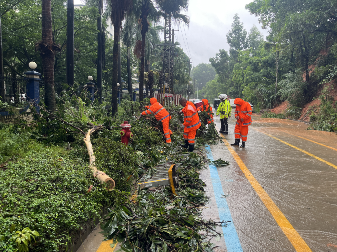 ▲市交通运输局龙华管理局工作人员清理倒伏树木、恢复现场交通。