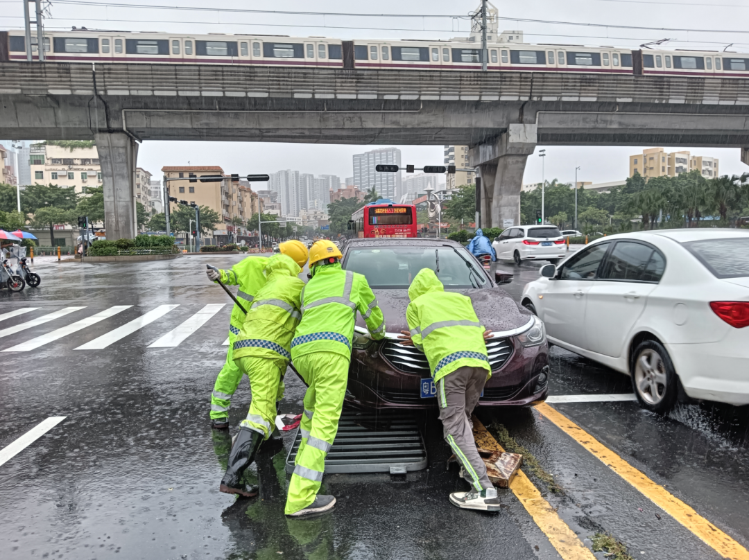 ▲在新沙路和宝安大道交汇处,一辆小车撞到护栏熄火,市交通运输局宝安管理局工作人员齐心协力将车移开,清除障碍扶正护栏,保证道路畅通。