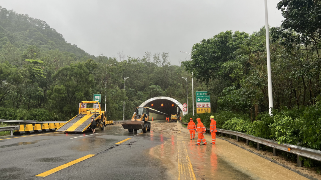 ▲新区大道隧道南行入口路段山体滑坡泥士阻碍交通,市交通运输局龙华管理局工作人员协助清理。