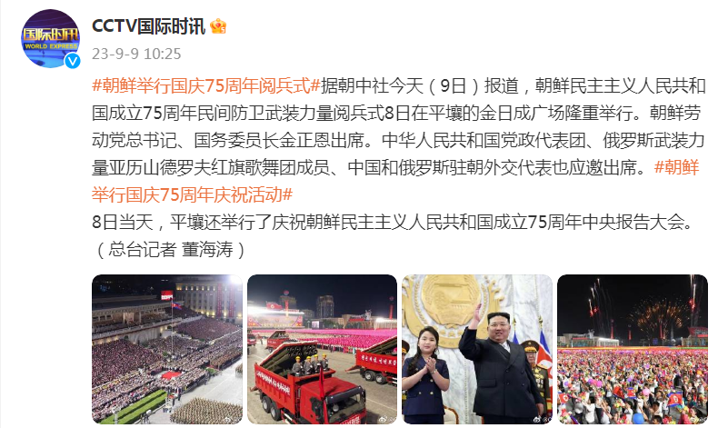 据朝中社今天(9日)报道,朝鲜民主主义人民共和国成立75周年民间防卫武装力量阅兵式8日在平壤的金日成广场隆重举行。朝鲜劳动党总书记、国务委员长金正恩出席。中华人民共和国党政代表团、俄罗斯武装力量亚历山德罗夫红旗歌舞团成员、中国和俄罗斯驻朝外交代表也应邀出席。