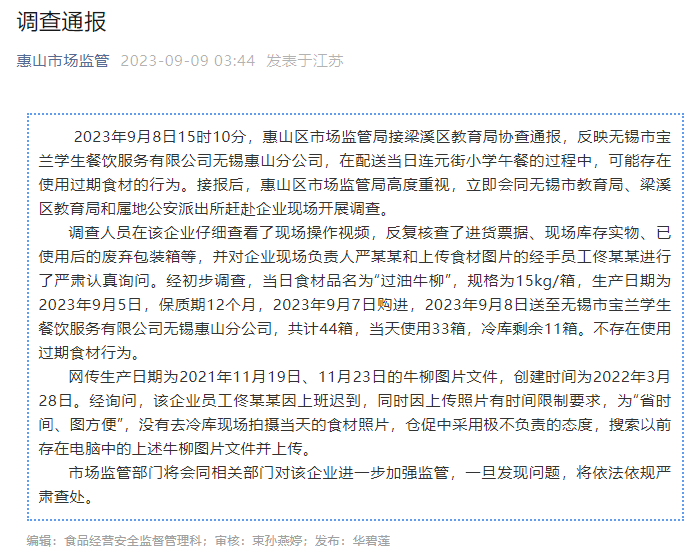 2023年9月8日15时10分,惠山区市场监管局接梁溪区教育局协查通报,反映无锡市宝兰学生餐饮服务有限公司无锡惠山分公司,在配送当日连元街小学午餐的过程中,可能存在使用过期食材的行为。接报后,惠山区市场监管局高度重视,立即会同无锡市教育局、梁溪区教育局和属地公安派出所赶赴企业现场开展调查。
