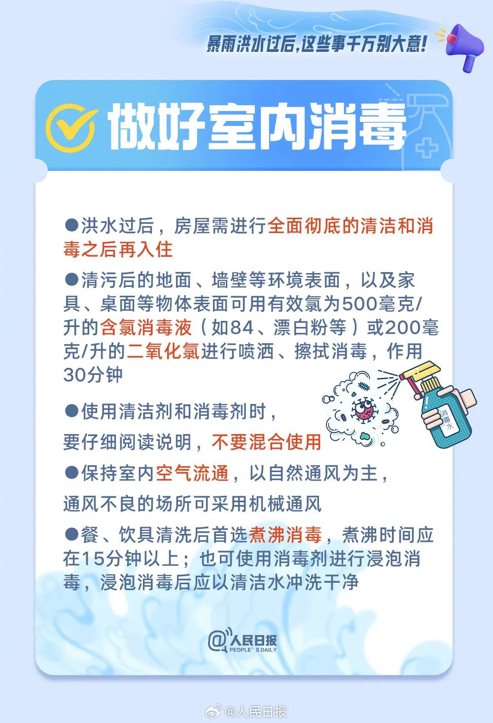 8月4日,国家疾控局发布洪涝灾区环境卫生处置与预防性消毒指引(2023版),包括生活饮用水、个人住宅等环境的清理与消毒,灾后村落和场所环境卫生处置、灾后个人健康教育与防护等方面。要点如下↓