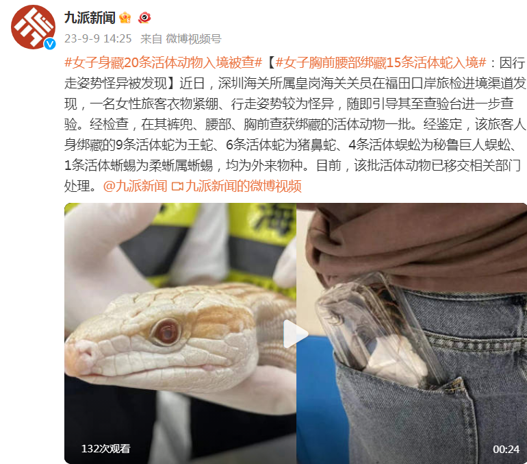 近日,深圳海关所属皇岗海关关员在福田口岸旅检进境渠道发现,一名女性旅客衣物紧绷、行走姿势较为怪异,随即引导其至查验台进一步查验。经检查,在其裤兜、腰部、胸前查获绑藏的活体动物一批。经鉴定,该旅客人身绑藏的9条活体蛇为王蛇、6条活体蛇为猪鼻蛇、4条活体蜈蚣为秘鲁巨人蜈蚣、1条活体蜥蜴为柔蜥属蜥蜴,均为外来物种。目前,该批活体动物已移交相关部门处理。
