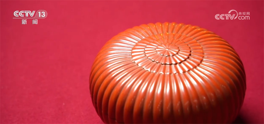 总台记者 杨雪: 与多穆壶一样,很多文物都是逐渐从生活用品演化成为艺术品的。像我们眼前看到的这一款清乾隆款朱漆菊瓣盒就是其中之一。它本来是盛放像干果、小点心等这些小件物品的盒子,在不断使用的过程中,逐渐演化成为了宫廷艺术品。