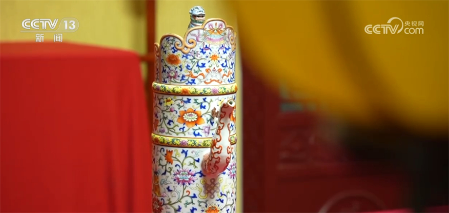 总台记者 杨雪: 沈阳故宫当中的很多珍贵院藏文物都见证了多民族文化融合的过程,像我们眼前看到的这款清乾隆款粉彩多穆壶就是其中之一。多穆在藏语当中是奶茶桶的意思,直到现在,像铜制、木制、皮质的很多多穆壶仍然被蒙、藏等少数民族沿袭使用着。大家可以看到,这款多穆壶的盖子上蹲坐着一只非常灵动的小狮子,有祈福和护佑主人的意思。这件多穆壶是国家一级文物,距今已经有200多年的历史了。