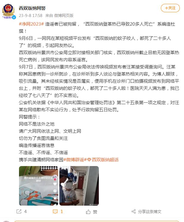 西双版纳州景洪市公安局立即对接相关部门核实,西双版纳州截至目前无因登革热死亡病例,该网民发布内容系谣言。