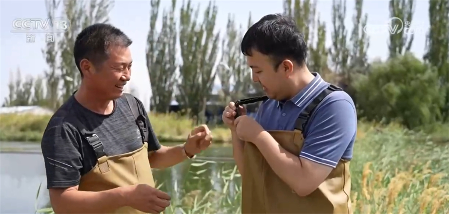 阿克苏市润泽养殖基地负责人 周京森: 这两个塘子占地16亩,水是来自天山的雪水,现在看上去水面很平静,但是到了丰收的季节,现在已经上市了,我邀请你体验一下我们的渔民生活。