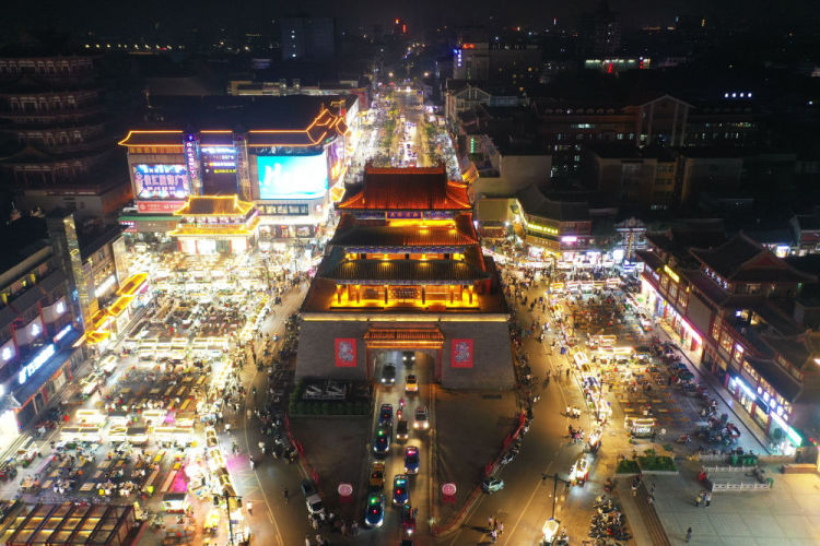 传统对接现代,古风演绎时尚。站在开封地标建筑鼓楼向东南方眺望,“鼓楼里”文化商业街华灯璀璨、人流熙攘。但多年以前,这里还是一片棚户区。为保护古城风貌,开封拆除违章搭建,将古典美学融入建筑风格,建成了远近闻名的历史文化风情街。