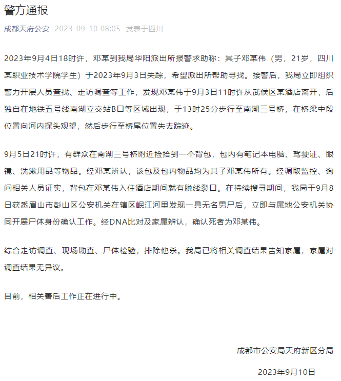 9月5日21时许,有群众在南湖三号桥附近捡拾到一个背包,包内有笔记本电脑、驾驶证、眼镜、洗漱用品等物品。经邓某辨认,该包及包内物品均为其子邓某伟所有。经调取监控、询问相关人员证实,背包在邓某伟入住酒店期间就有脱线裂口。在持续搜寻期间,我局于9月8日获悉眉山市彭山区公安机关在辖区岷江河里发现一具无名男尸后,立即与属地公安机关协同开展尸体身份确认工作。经DNA比对及家属辨认,确认死者为邓某伟。