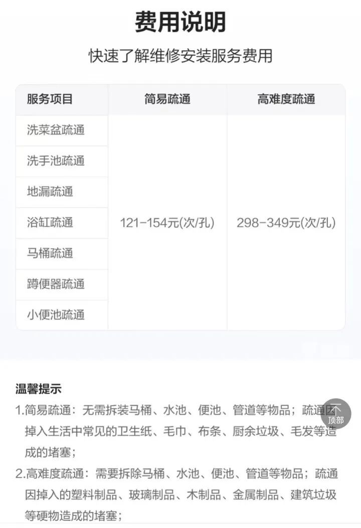 平台页面清楚地写着,简易疏通121-154元(次/孔),高难度疏通298-349元(次/孔)。 “我想即使最贵就是349元,在可接受范围之内。”诸葛女士说。