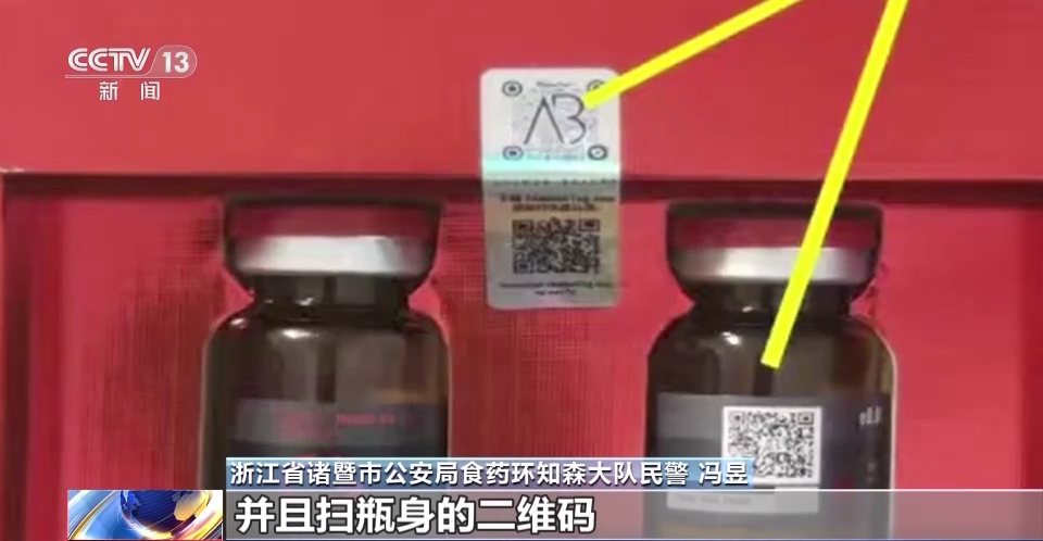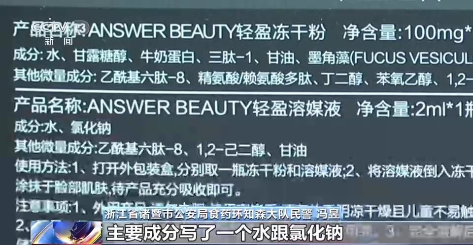 浙江省诸暨市公安局食药环知森大队民警冯昱:为了躲避监管,在上面并没有标注司美格鲁肽的主要成分,主要成分写了一个水跟氯化钠,其实是将主要成分给隐掉的。同时在使用方法上面,也是为了逃避监管,将涂抹的使用方法写在上面,而实际上都是使用注射的方式,并且还使用了化妆品的备案字号来逃避监管,让监管人员误以为它是化妆品,但其实它的最终使用途径都是注射。