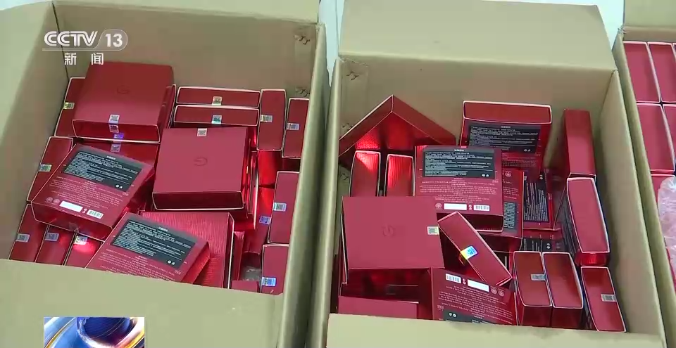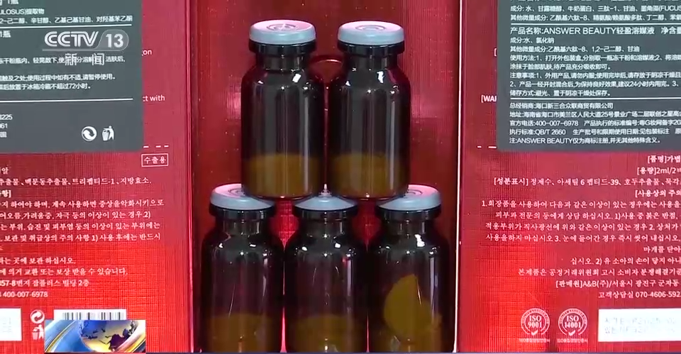 浙江省诸暨市公安局食药环知森大队民警冯昱:使用了一些易损的标签,所谓的八星防伪,其实就是撕下来标签之后,它会残留贴着的贴纸,就会产生一个八角形的形状,并且瓶身的二维码跟盒子上的二维码,扫描进去都会有一个韩文的网站,这个网站也是他们自己架设的。
