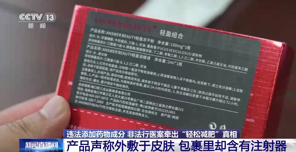 日前,浙江省诸暨市市场监管局和相关部门在检查一起非法行医的案件中,发现当事人刘某在使用一种名为“AB轻盈素”的产品对消费者进行注射。执法人员调查发现,这种AB轻盈素的红色包装盒里面包含有一瓶液体和一瓶冻干粉末,号称能全面替代传统瘦身产品。同时宣称不吃药,不手术,不脱水,不节食,不忌口,能一周一次减重3—7斤。然而,执法人员却在其精美的外包装上发现了问题。
