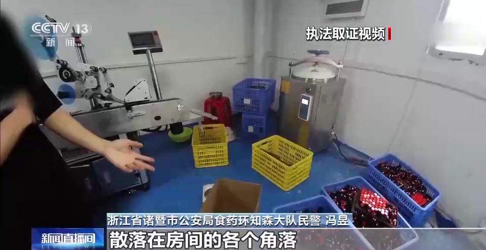 浙江省诸暨市公安局食药环知森大队民警冯昱:在他们医美化妆品有限公司的一个轻盈素的生产车间,产品都是非常凌乱地散落在房间的各个角落的,旁边污水纵横,是非常恶劣的环境。