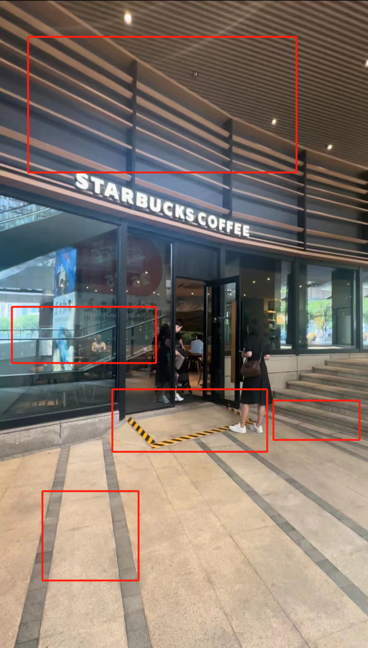 网传图片中比较具有辨识度的店面设计、门口台阶、地砖、窗口反射的电梯画面等,都能与星巴克(览海国际广场店)的环境图一一对应。
