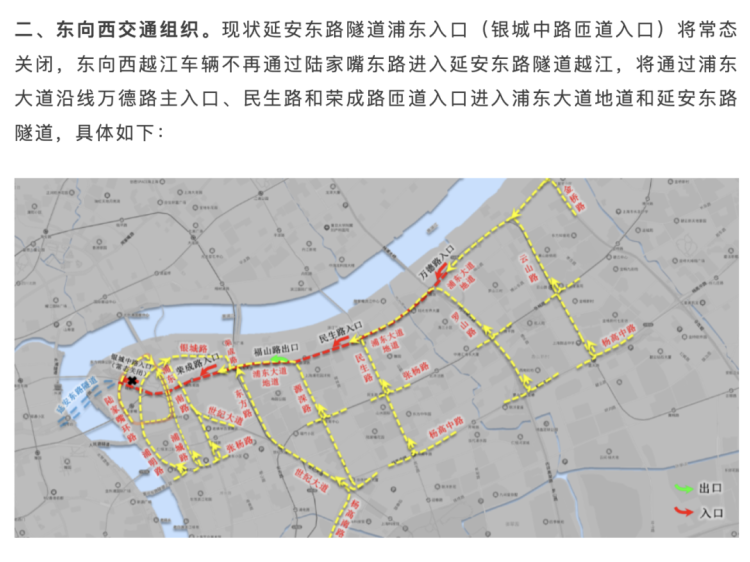 上海市政府在去年12月19日发布的通知中表明,浦东大道地道工程于2022年12月23日通车后,浦东延安东路隧道银城中路匝道入口将常态关闭。