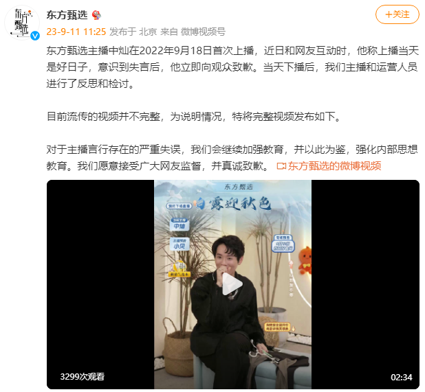 东方甄选主播中灿在2022年9月18日首次上播,近日和网友互动时,他称上播当天是好日子,意识到失言后,他立即向观众致歉。当天下播后,我们主播和运营人员进行了反思和检讨。