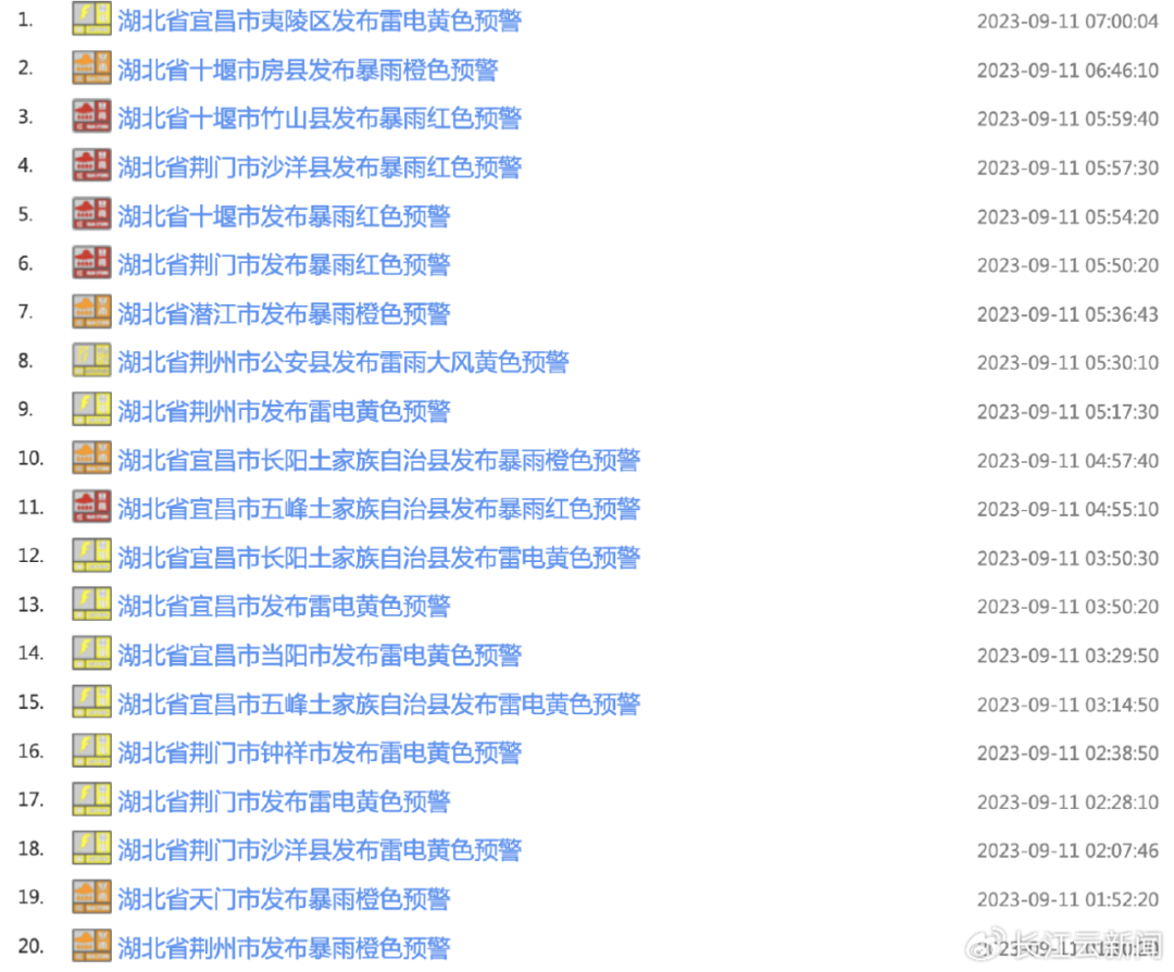 昨夜凌晨至今早,湖北宜昌、十堰、荆门、潜江、荆州、天门等地发布雷电、暴雨预警!