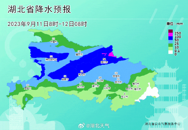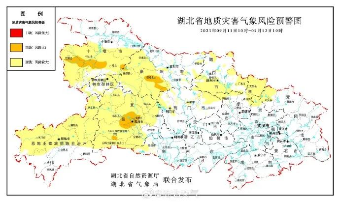 2023年9月11日10时—9月12日10时,预计三峡库区,神农架林区、襄阳地区、宜昌地区、随州地区,十堰(十堰市城区南部、郧阳西南部、竹溪、竹山、房县、丹江口南部)、恩施(恩施市、建始、利川、咸丰北部、宣恩北部、鹤峰北部)、荆门(荆门市城区、钟祥、京山)、荆州(松滋)、孝感(大悟、安陆、孝昌东北部)、武汉(黄陂北部)、黄冈(红安中部和北部)以及其他强降水区域发生崩塌、滑坡、泥石流的风险较大;其中,十堰(竹溪中部和东部、竹山中部、房县中西部和东部)、襄阳(保康北部局部、南漳中部和东南部、宜城西南部)、宜昌(宜昌市城区西部、夷陵南部、长阳东北部和南部)发生崩塌、滑坡、泥石流的风险大。