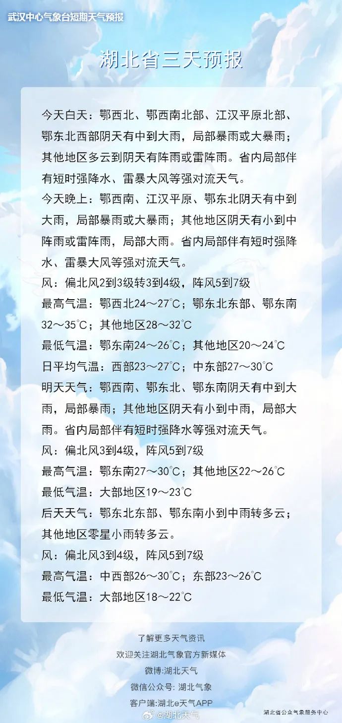 今天湖北省内局部伴有短时强降水、雷暴大风等强对流天气。明天鄂西南、鄂东地区阴天有中到大雨,局部暴雨,其他地区阴天有小到中雨,局部大雨。湖北省内局部伴有短时强降水等强对流天气。后天全省雨势及范围减弱减少,鄂东北东部、鄂东南小到中雨转多云,其他地区零星小雨转多云。