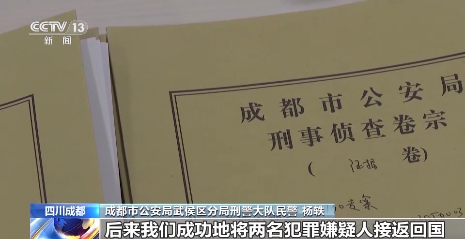 成都市公安局武侯区分局刑警大队民警 杨轶:通过公安的技术手段,掌握了两名犯罪团伙嫌疑人身份信息。掌握身份信息之后我们就兵分两路,第一我们派了工作组到犯罪嫌疑人家属(处)去开展劝返工作;另外一个组就到境外,找到了犯罪嫌疑人开展劝返工作。经过我们长时间的努力,后来成功地将两名犯罪嫌疑人接返回国。回国之后通过他们的供述和交代,我们把之前掌握的这些代号和真实身份一一对应起来,从而整个案件就撕开了口子。