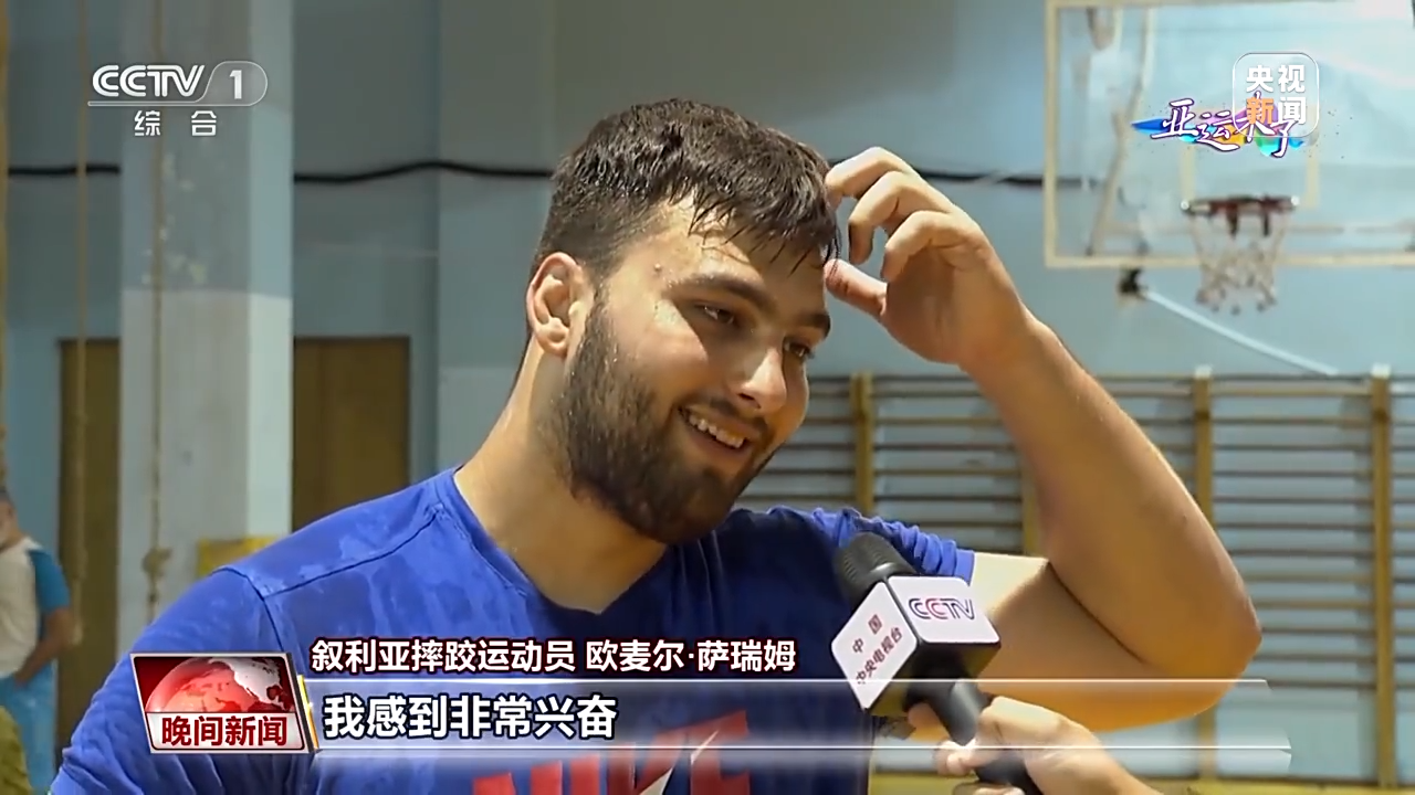 叙利亚摔跤运动员 欧麦尔·萨瑞姆:能去中国参赛,我感到非常兴奋。我的很多朋友跟我说中国像是另一个世界,中国经济发展迅速,世界领先,我相信在亚运会赛场上会有很多令人惊叹和美好的事发生。