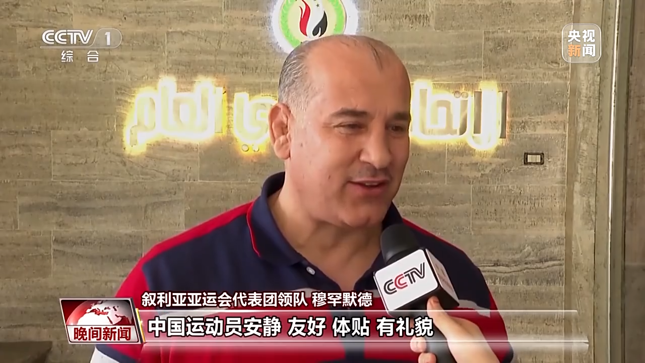 叙利亚亚运会代表团领队 穆罕默德:中国运动员安静、友好、体贴、有礼貌,我能从中国运动员身上感受到体育的精神,他们都彬彬有礼,祝他们好运。