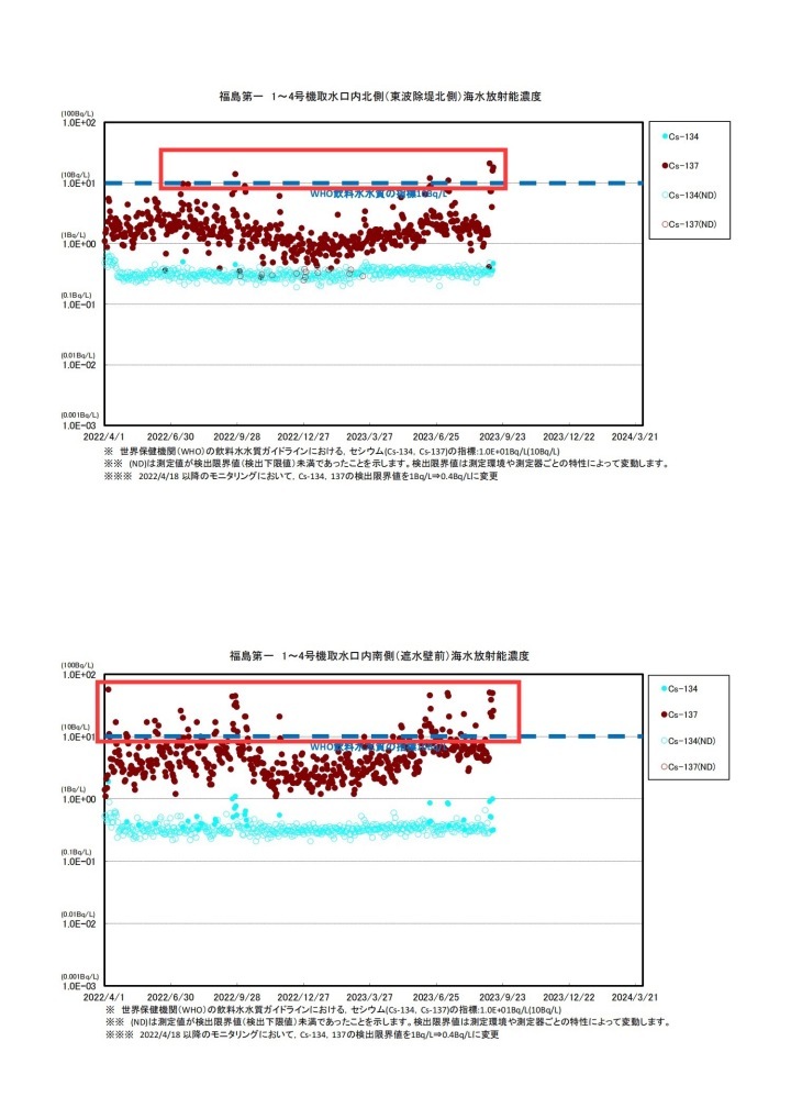 此外,潮新闻记者梳理日本东电公司官网发布的监测数据发现,自启动核污染水排海以来,1~4号机取水口内检测出的铯-137元素含量明显高于以往。