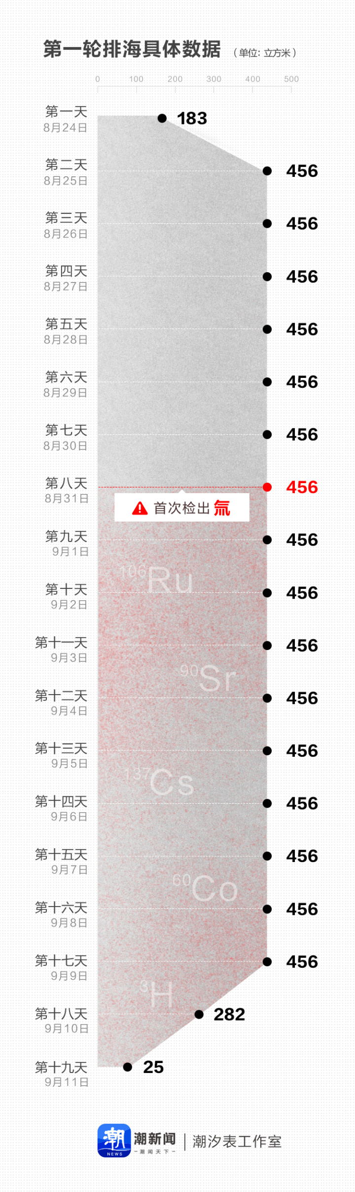 本次取样海水中的放射性物质氚浓度为每升10贝克勒尔。报道称,工作人员在福岛第一核电站方圆3公里设置了10个取样点,本次检出氚的海水取自最靠近排放口的取样点,该取样点于24日取样的海水中氚浓度为2.6贝克勒尔,当时的常规分析未达到检出下限。