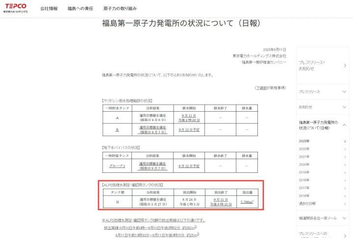 当地时间9月12日,据日本东京电力公司在官网公布的信息显示,截至11日中午12点15分,福岛第一核电站核污染水首轮排海结束,首轮累计排放量为7788立方米。