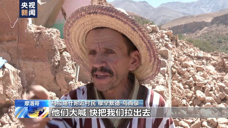 马拉喀什附近村民 穆罕默德·乌尚泉:我听到人们发出垂死挣扎的求救声,他们大喊,快把我们拉出去,在我脱险后我就赶紧去救人。我听到一个女人,我妹妹的声音,她大喊着,哥哥救救我们。我赶紧刨啊刨,把她和她的儿子,她的丈夫一起救了出来。我们拼命救人,但因为没有工具,只能徒手,我看到了我妹妹的头部,然后就一个劲地用手挖。