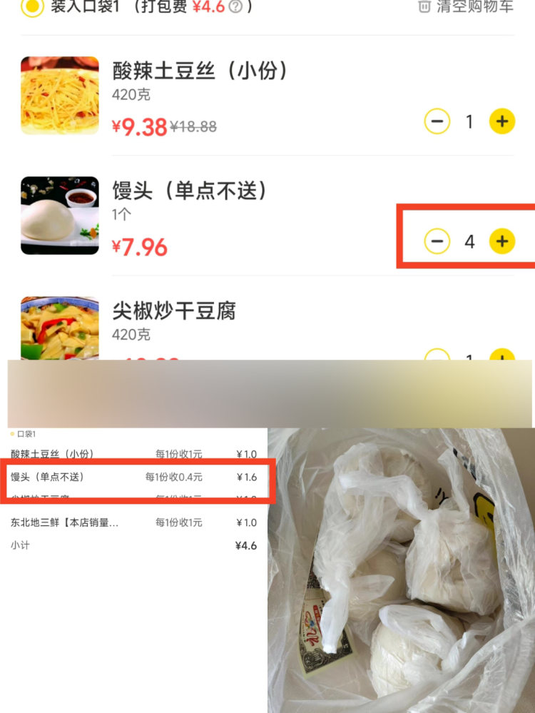 记者在某外卖平台点单发现,北京市朝阳区一家饭馆所售的老面馒头线上单价为1.9元,但每个馒头要单独收取0.4元打包费,四个馒头共收取了1.6元打包费。为什么不把馒头放在一个包装袋里算一次打包费,而是单独收取?对此,商家回应称,打包费是由平台设置的。