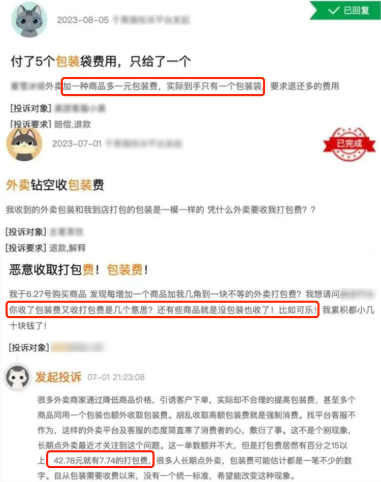 记者在某投诉平台上查询发现,消费者主要投诉的问题包括:随餐饮料需收取包装费、分装食品配料和勾选餐食口味需收取包装费,以及过度包装出现不必要的包装费。