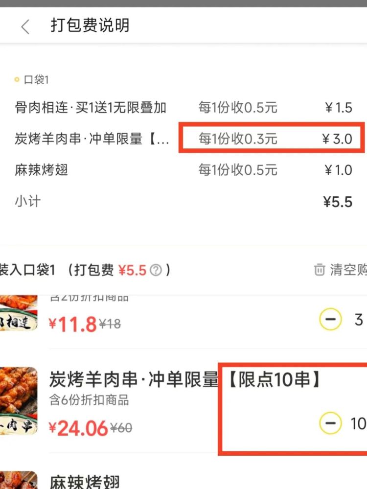 记者线上下单了10串炭烤羊肉串,但每一串都要单独收取0.3元打包费,10串共收取了3元打包费。商家承认,虽然每串都单独收取打包费,但配送前都是“拿锡纸一包了事儿”,并不会单独包装。