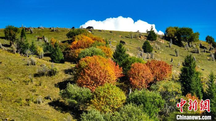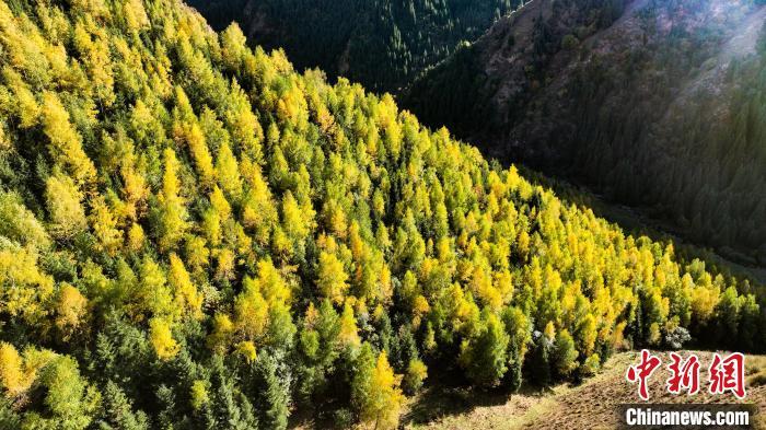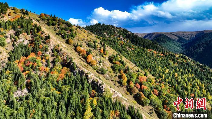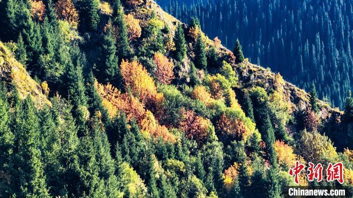 金秋九月,新疆昭苏县多浪峡谷的松林里呈现出斑斓的“调色板”,除了寻常色彩,黄色的桦树、红色的灌木与绿色的松林形成斑斓画卷。多浪峡谷位于天山深处的木扎尔特冰川北坡,是一片原始森林,距离昭苏县城约70公里。这里地势陡峭,密林沟壑,松林与多种生物群落交错生长,植物体系兼备乔、灌、草、藤,如一座天然的植物园。