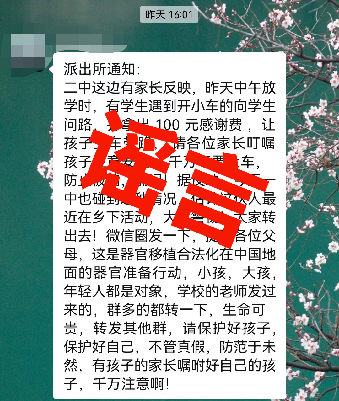 该谣言信息早在2016年就已在全国多地出现转载传播,多地公安机关均已辟谣。该消息打着“安全教育”的旗号,造谣惑众,煽动家长转发,在社会上,尤其是在广大学生和家长中造成了不良影响。