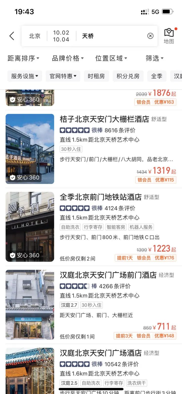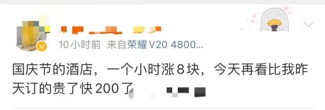 “做国庆旅行攻略发现,北京、上海、成都的如家、汉庭酒店全部涨价,日常300元/晚的大床房基本都涨到了700元甚至近千元。”据报道,多个网红旅游目的地城市,经济型酒店国庆房型房价直逼高端度假酒店房价。
