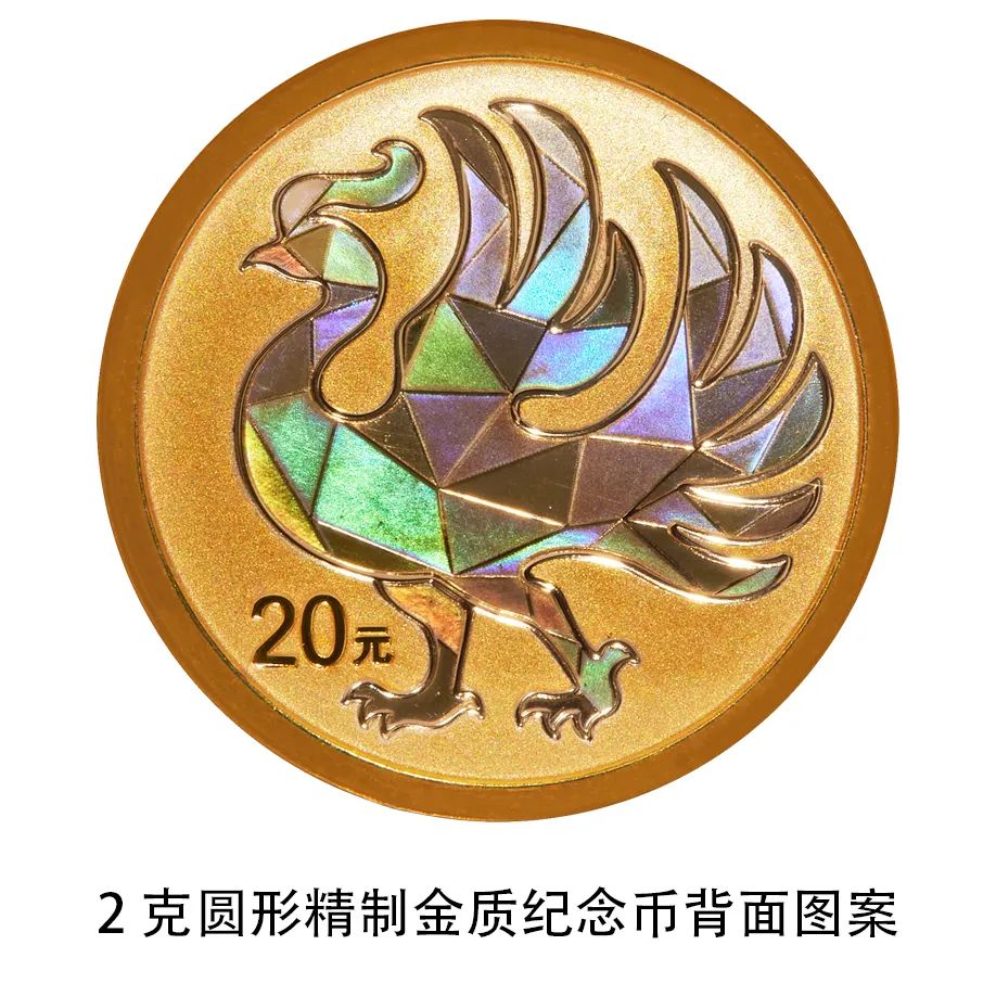2克圆形金质纪念币背面图案为装饰凤凰造型,并刊面额。
